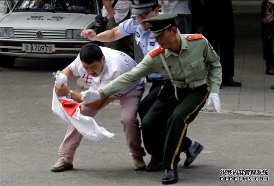 •   爱国人士在日本驻华大使馆前想要焚烧一面日本国旗并举行抗议活动。
